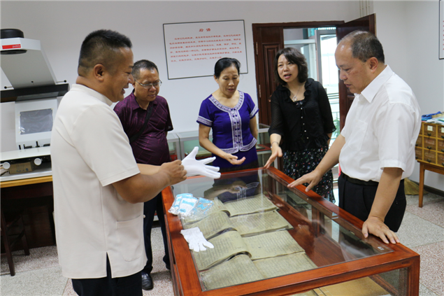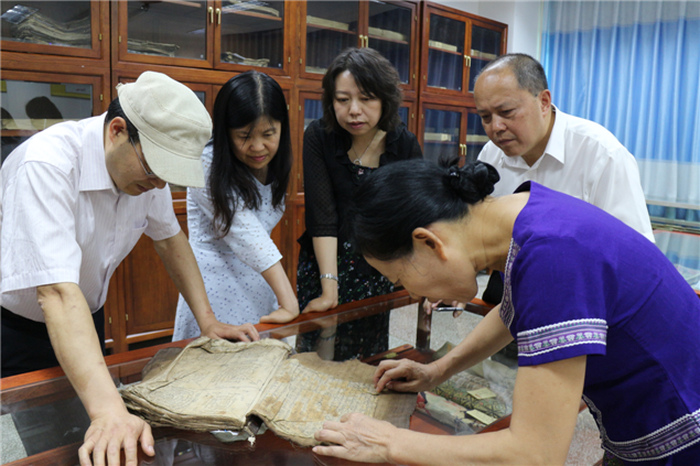 6月1日,国家图书馆原副馆长、研究馆员陈力,北京语言大学教授戴红亮,国家古籍保护中心研究馆员庄秀芬一行,在云南省古籍保护中心办公室主任计思诚的陪同下,到西双版纳州图书馆,对该馆申报“第六批全国古籍重点保护单位”进行实地复核,对申报《国家珍贵古籍名录》存疑书目进行现场核验。