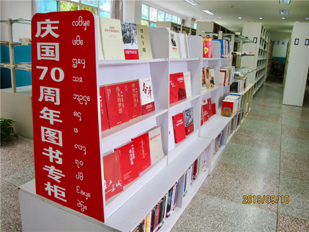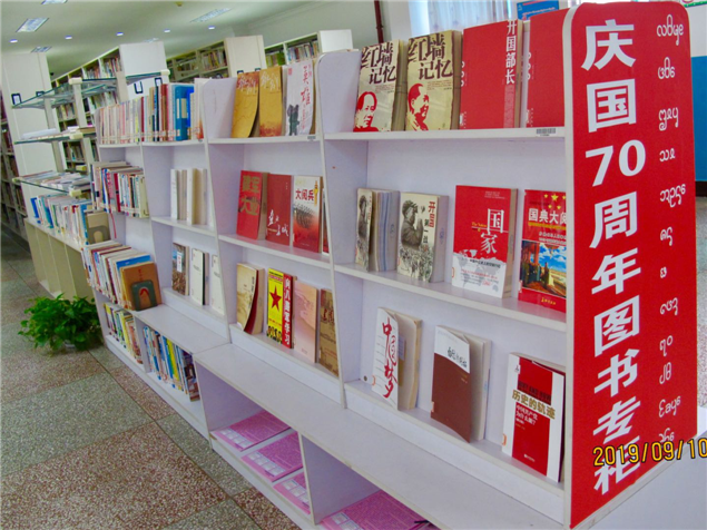 为庆祝中华人民共和国成立70 周年,讴歌辉煌历史、弘扬传统文化、培育民族精神,州图书馆在自助借阅室第一阅览区设立庆祝新中国成立70周年专题图书专柜,开展以“我和我的祖国”为主题的读书活动。