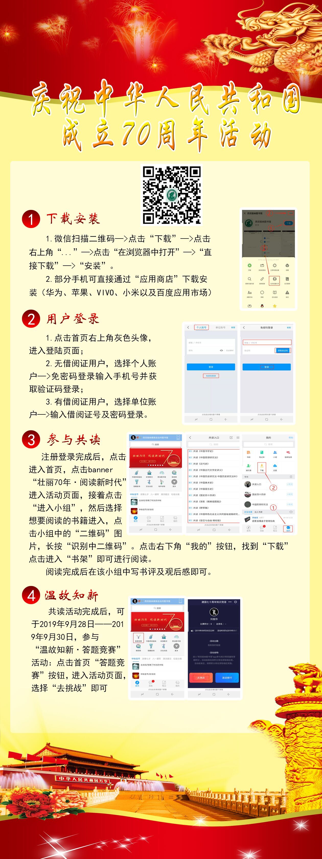 为庆祝中华人民共和国成立70周年活动,州图书馆举办“辉煌70年,温故而知新,我们一起共读一本书”知识竞赛活动,活动时间:2019年9月28日——2019年9月30日;活动地点:州图书馆线上;活动对象:广大市民。欢迎广大家民踊跃参加!