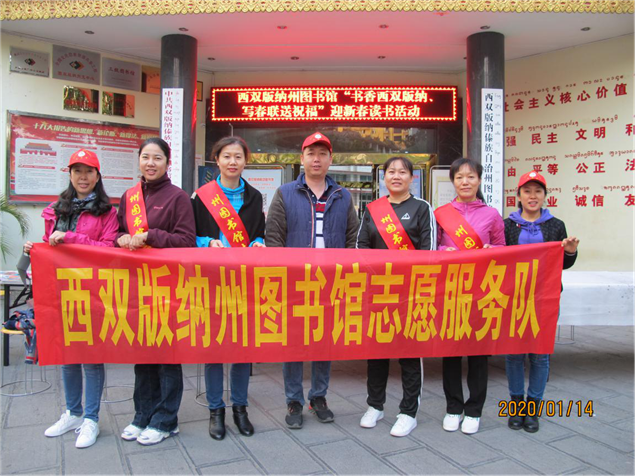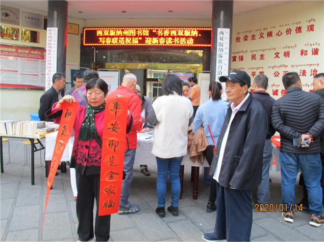 1月14日,由州文旅局主办,州图书馆承办的“书香西双版纳版纳 写春联送祝福”迎新春活动在州图书馆大楼前举行,丰富的文化活动,让市民提前感受到具有书香年俗味的中国年。