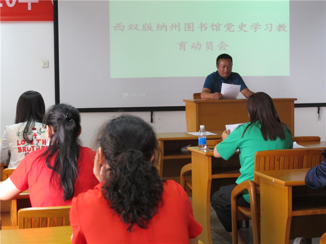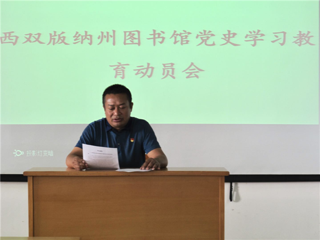 州图书馆负责人周杨鑫按照省委、州委的会议精神和有关要求,动员州图书馆全体党员干部职工要紧紧围绕践行初心使命开展学习教育,学好百年党史,传承红色基因,发扬党的光荣传统和优良作风,以更加饱满的精神状态,积极为西双版纳建设尽一份力,以优异的成绩庆祝中国共产党成立100周年。(文图:西双版纳州图书馆 张春华)
