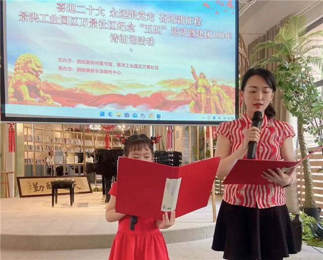 今年是中国共产主义青年团成立100周年、五四运动103周年,为深入学习宣传贯彻习近平新时代中国特色社会主义思想,大力弘扬“五四”精神,2022年5月4日,由西双版纳州图书馆联合景洪工业园区万景社区开展的喜迎二十大 永远跟党走 奋进新征程 景洪工业园区万景社区纪念“五四”运动暨建团100年诗朗诵活动在州图书馆万景社区分馆举行。