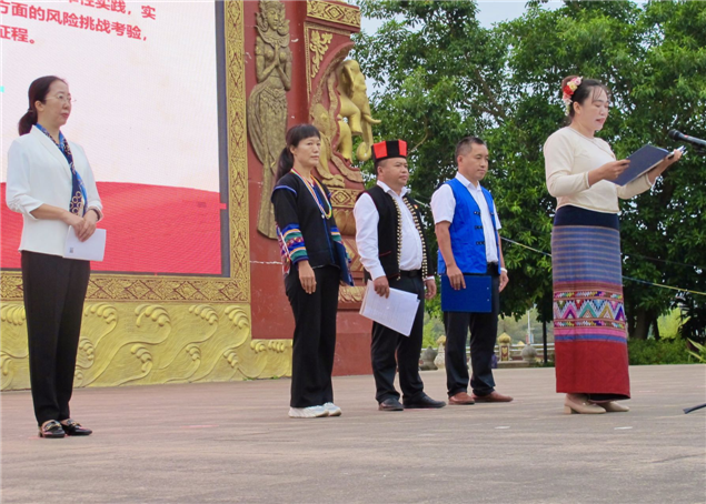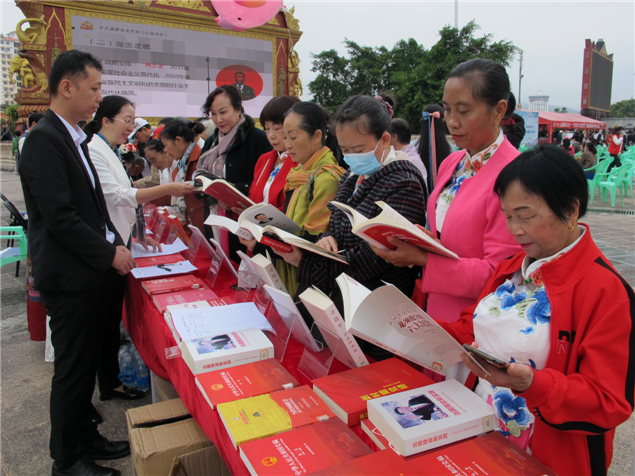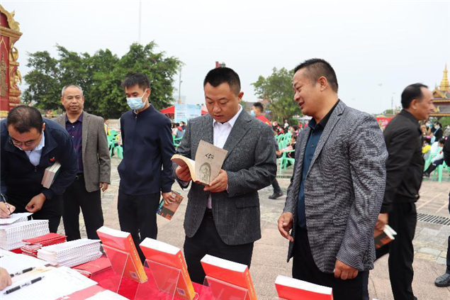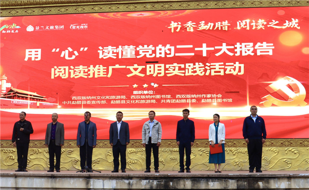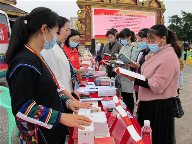 活动现场,5名群众分别用汉语、傣语、哈尼语、瑶语、彝语朗读党的二十大报告节选内容,传递党的声音,让党的二十大精神进基层、进村寨、进社区。在图书推荐阅读现场,州图书馆和勐腊县图书馆工作人员向读者们推荐党的二十大相关图书九种、《习近平谈治国理政》等红色经典文学作品和推荐扫码阅读相关红色电子图书。同时,州图书馆还向相关单位干部群众现场赠送《党的二十大报告》单行本和本土作家边八哥的文学作品《神象的女儿们》《失踪》《泥塘》;朱建峰的“热带雨林”系列儿童文学作品《之人象情》共200余册,勐腊县图书馆赠送期刊共50余册。州、市书法家协会书法爱好者挥毫泼墨现场书写党的二十大报告经典古语。现场摆放“用‘心’读懂党的二十大报告”和“党的二十大报告提到的10个中国古语”展板21块。勐腊县有关部门和单位、当地民众积极参与,活动还举行了诗朗诵及文艺表演等,文明阅读之风充溢勐腊县城。(文图:西双版纳州图书馆 张春华)