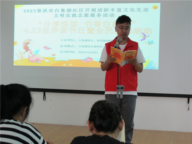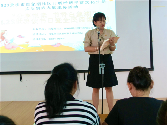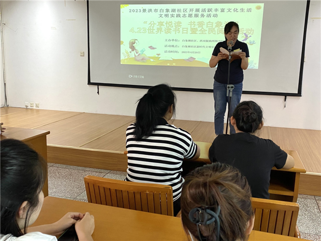 为贯彻党的二十大精神,促进“书香支部”建设,激发党员干部的读书兴趣,2023年4月20日下午,西双版纳州图书馆党支部联合景洪市白象湖社区在图书馆讲座室举办了“分享悦读 书香白象湖”“4.23”经典诵读阅读推广活动。