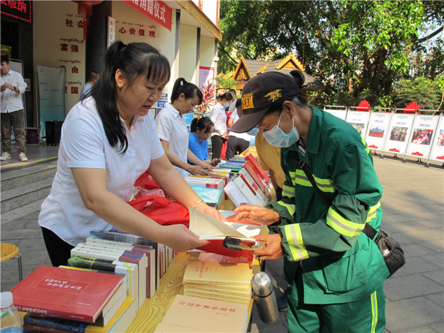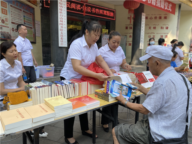 在雨林华庭分馆现场,州图书馆还与嘎栋街道办事处联合举办4·23全民阅读活动,以“学习党的二十大精神”宣讲会、“阅享新时代”读书分享会、读书沙龙等内容,开展人人推荐一本好书、读书感受分享。