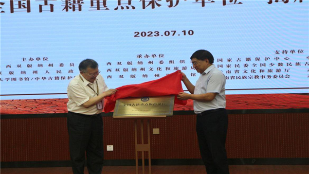 揭牌仪式现场,国家图书馆常务副馆长/国家古籍保护中心副主任张志清和西双版纳州人大常委会副主任张云洪为“全国古籍重点保护单位”揭牌;云南省文化和旅游厅副厅长王江红和西双版纳州政协副主席白玲为“云南省傣文古籍保护研究服务中心”揭牌。还举行了由国家古籍保护中心为云南省图书馆成立“国家级藏文古籍修复基地和技艺传习中心”的授牌仪式。