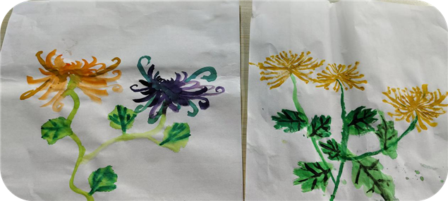 经过几天的学习与练习,孩子们笔下的菊花作品终于完整呈现。一朵朵栩栩如生的菊花在宣纸上绽放,或娇艳欲滴,或傲霜挺立。孩子们用色彩与线条,展现出对国画的理解与感悟,每一幅作品都独具特色。