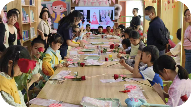 现场互动环节精彩纷呈。在“剪刀、石头、布”游戏中,家长和孩子全身心投入,欢笑声、加油声交织,将气氛推向高潮。手工制作玫瑰花送妈妈的环节更是温情满满。在工作人员指导下,孩子们精心制作,每一片花瓣都饱含着对妈妈的爱。当孩子们把花送给妈妈时,妈妈们的脸上满是幸福与感动。