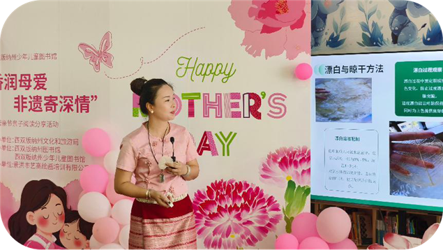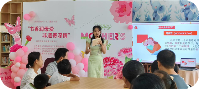 5月11日上午,在第112个母亲节到来之际,西双版纳州少年儿童图书馆以“书香润母爱,非遗寄深情”为主题,为25组亲子家庭献上一场充满文化温度与情感共鸣的阅读盛宴。活动由西双版纳州文化和旅游局主办,西双版纳州图书馆、西双版纳州少年儿童图书馆承办,以阅读为纽带、非遗为载体,书写了母亲节的动人篇章。