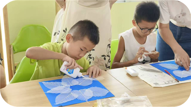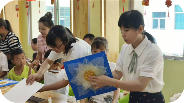 最具特色的非遗手工环节,将文化传承与节日祝福巧妙融合。亲子携手制作菩提叶叶脉装饰画,孩子们用金色颜料勾勒木雕花型,家长则耐心协助将叶脉组合成绽放的菩提花。一片片叶脉承载着传统工艺的巧思,也凝结着孩子对母亲的感恩心意,这份亲手打造的节日礼物,让非遗文化在指尖传递温情。