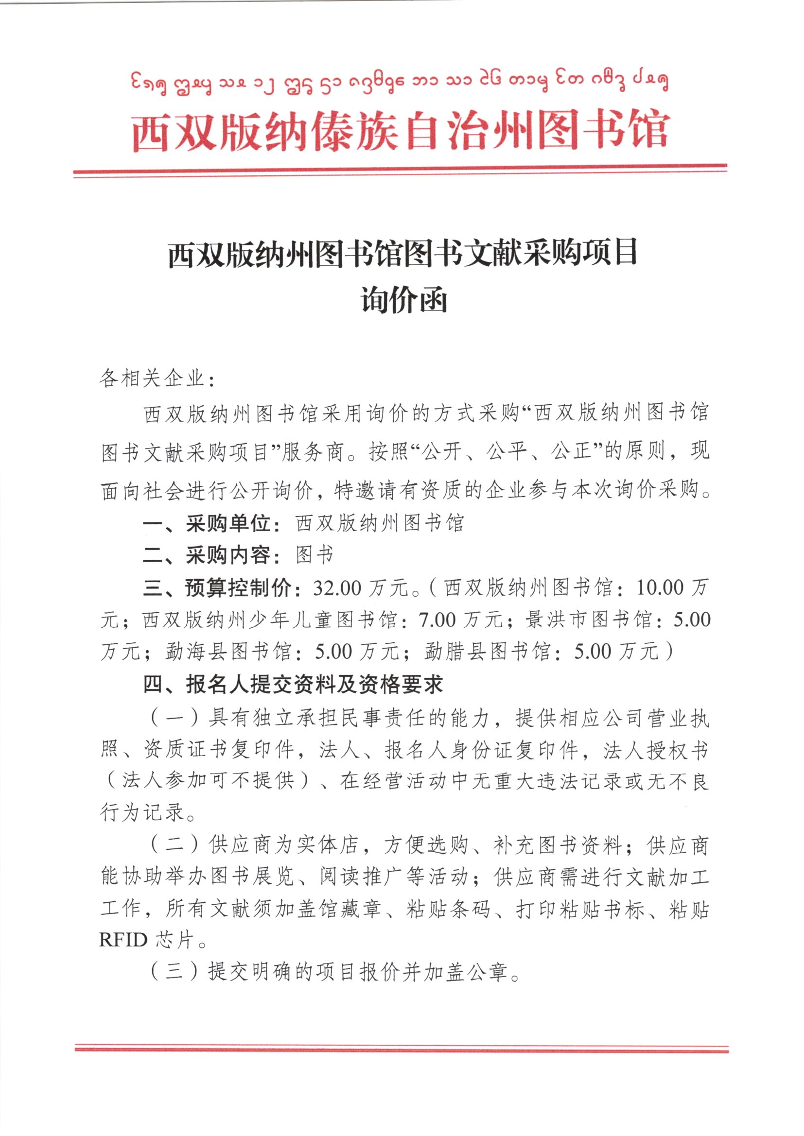 西双版纳州图书馆图书文献采购项目询价函