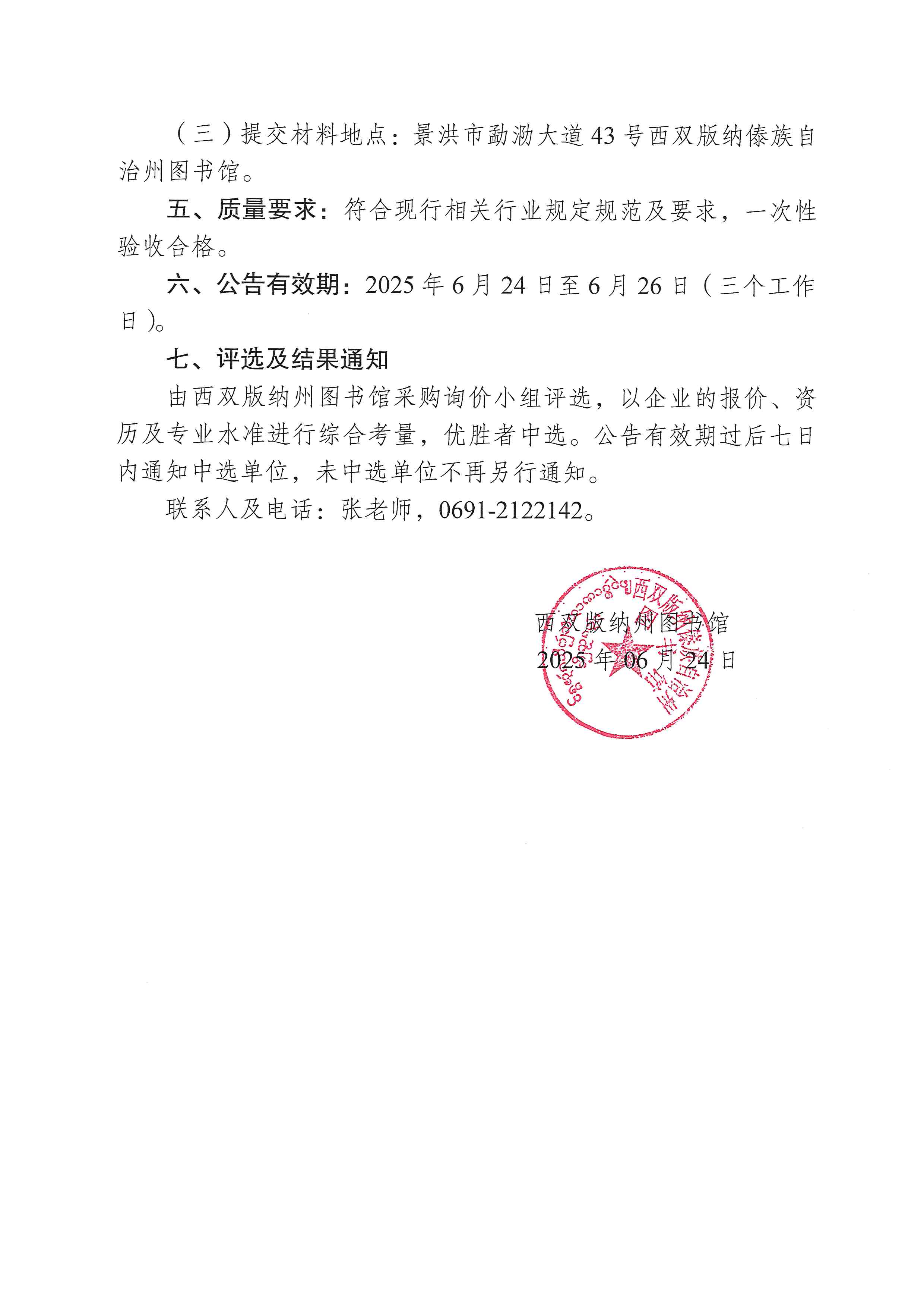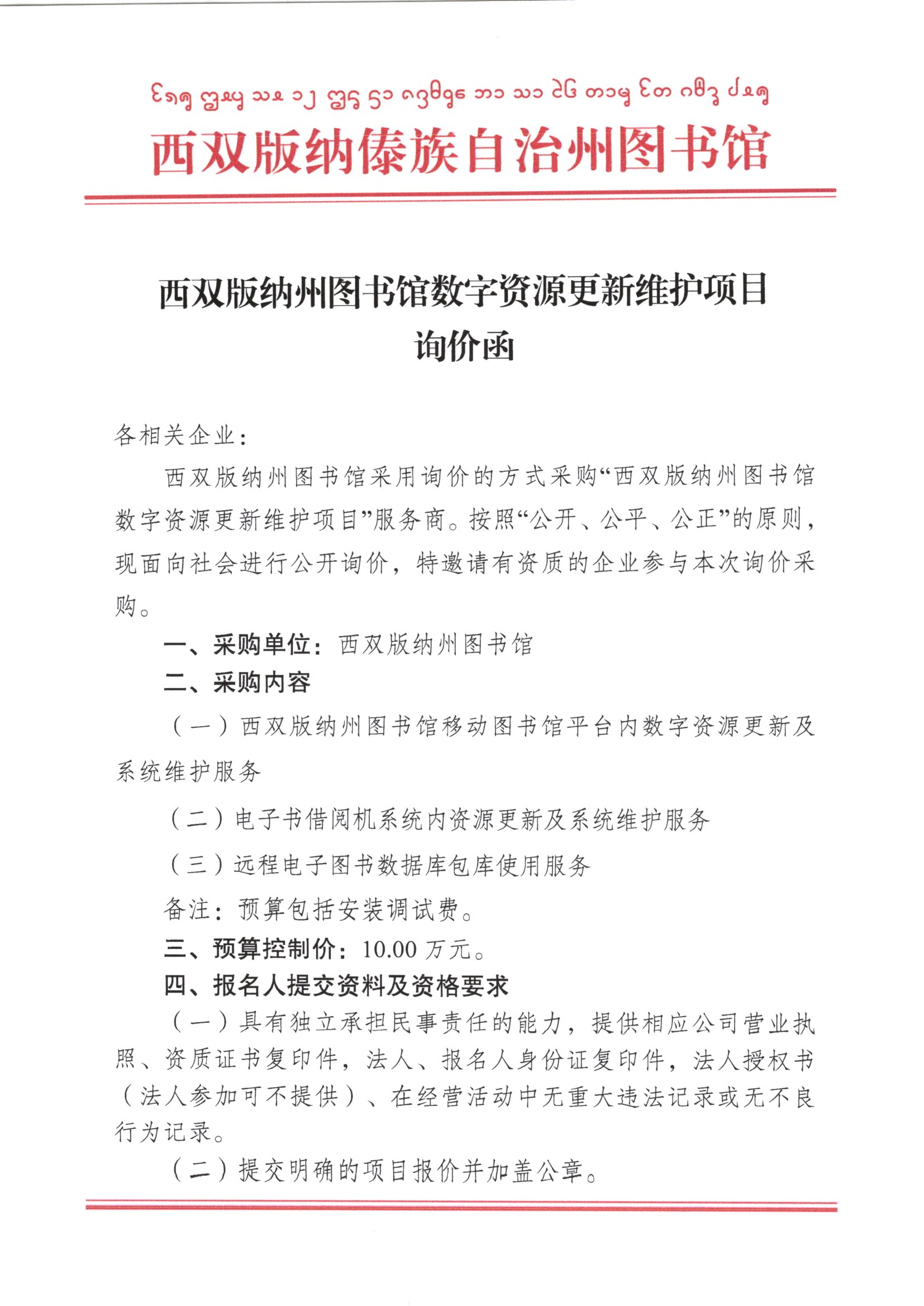 西双版纳州图书馆数字资源更新维护项目询价函