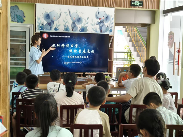 课程最后,云南民族大学理论宣讲团为孩子们带来了榜样力量的宣传。分享人王茜婕绘声绘色地讲述了缉毒警察柯占军的故事,孩子们深受触动。令人惊喜的是,许多小朋友表示自己听说过柯占军叔叔,还主动上台分享他们心中的英雄故事。