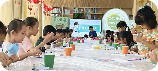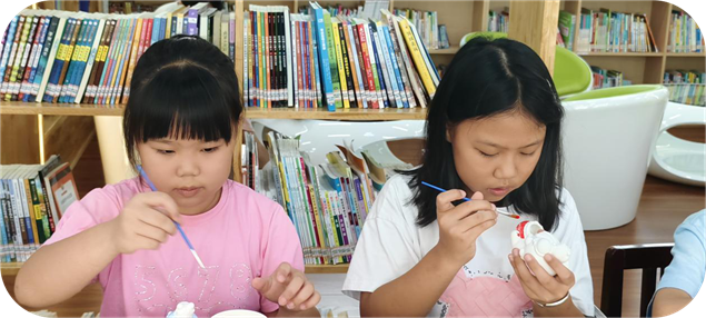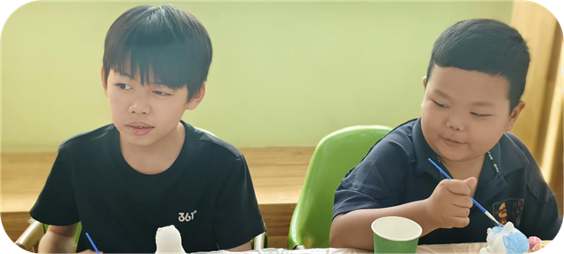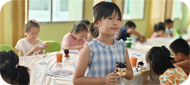 手工涂色环节充满创意与欢乐。工作人员分发了哪吒系列石膏娃娃和涂色材料,孩子们专注创作,有的调配色彩,有的与小伙伴互相出主意,想象力与创造力尽情释放,活动室里充满欢声笑语。