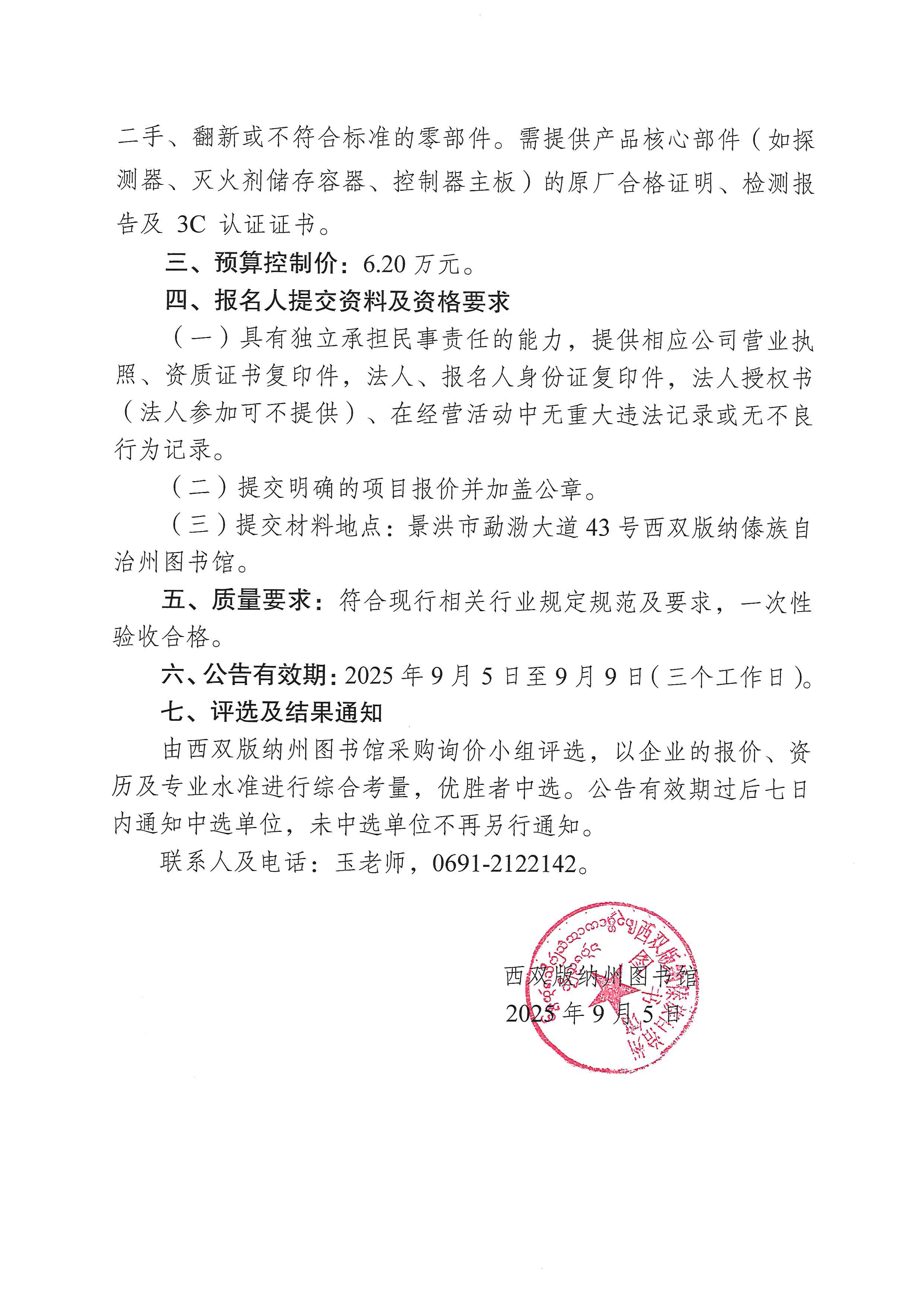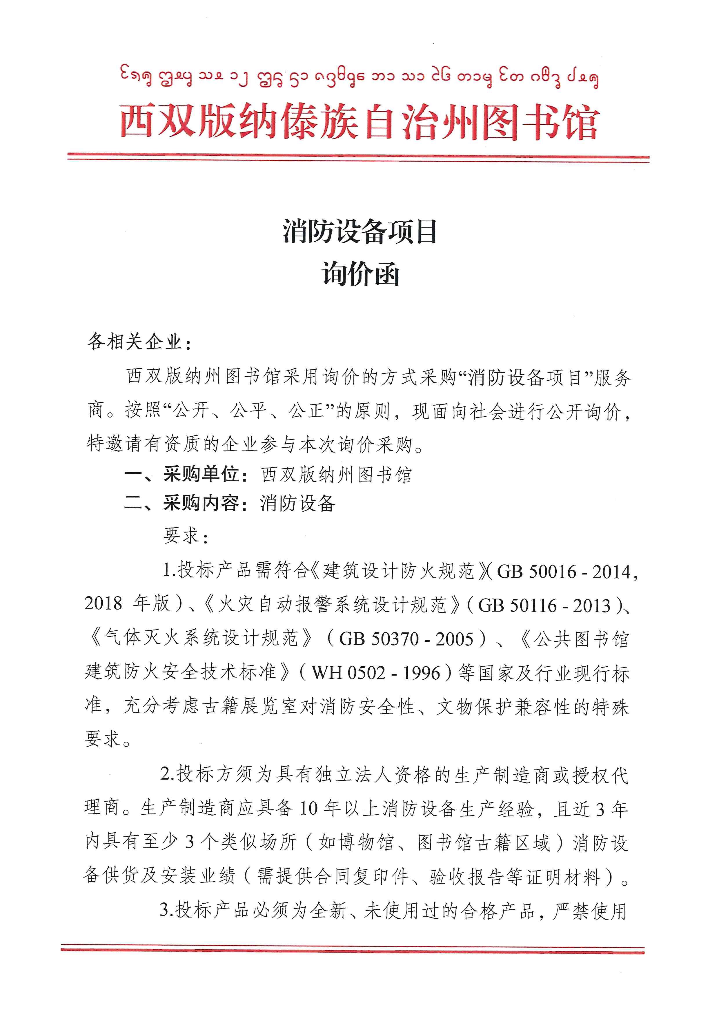 西双版纳州图书馆消防设备项目询价函