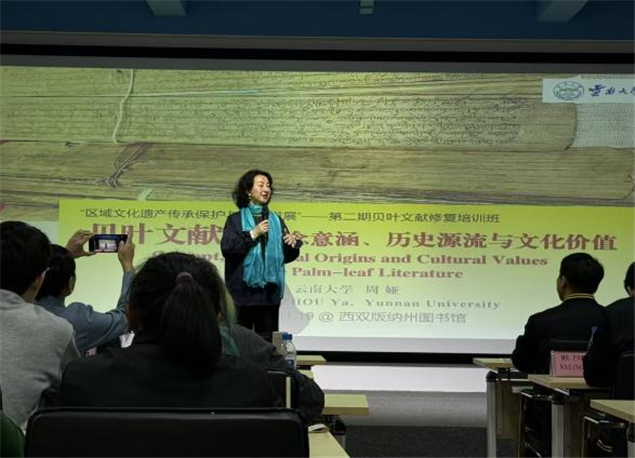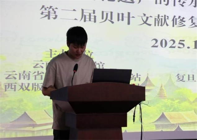 作为澜湄流域文化遗产保护的重要实践载体,本次培训班由云南省图书馆、云南省杨玉良院士工作站、西双版纳州文化和旅游局联合主办,西双版纳州图书馆与复旦大学相关机构承办,汇聚了国内外47名各界代表参与。开班仪式上,云南省图书馆、西双版纳州文旅局及复旦大学相关领导,通过现场和线上先后致辞,杨玉良院士通过书面致辞寄语参训人员传承文化使命。随后举行的揭牌仪式,构建起“收藏-修复-传承”的完整链条:贝叶经文献馆为文献提供专业化收藏展示平台,贝叶经修复室成为技术创新核心阵地,而培训班则承担起人才培育的重要职责。当天,云南大学副教授周娅、云南省少数民族古籍整理出版规划办公室副译审依旺的,分别以“贝叶文献概念意涵、历史源流与文化价值”和“贝叶经保护研究的宏观视野与跨语际研究实践——傣文贝叶经和缅文贝叶经为例”为题开展主旨讲座,为培训拉开学术序幕。