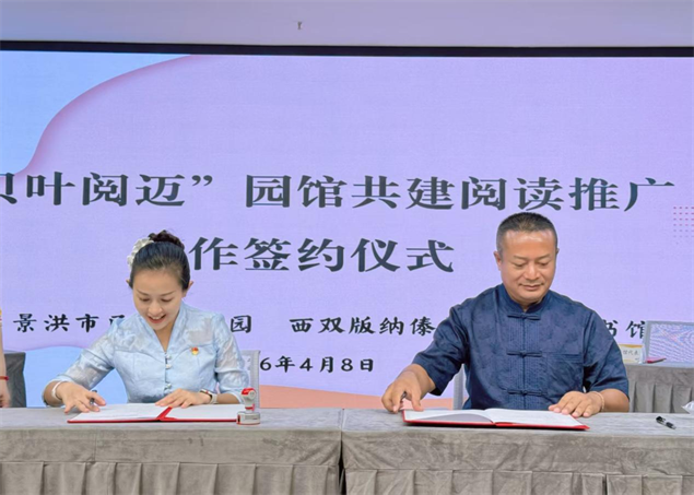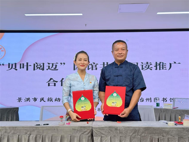 2026年4月8日,西双版纳州图书馆与景洪市民族幼儿园“贝叶阅迈润童年·傣韵共育筑新程”家园社协同育人活动暨“贝叶阅迈”园馆共建阅读项目签约仪式,在幼儿园汇演厅圆满举行。州图书馆、新城社区、家委代表及全园师幼共同参与,见证学前阅读与民族文化传承的重要时刻。