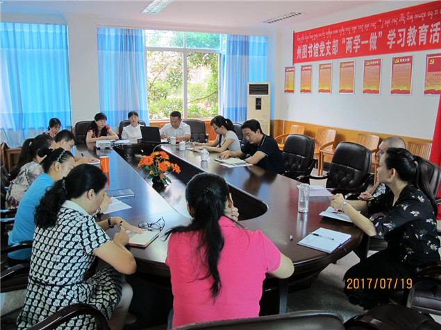 2017年7月19日上午,州图书馆党支部组织党员干部在二楼党员活动室开展学党章党规,学系列讲话,做合格党员“两学一做”学习教育会。州文体广电局党组书记局长黄臻到会参加并指导工作。会上他与州图书馆全体党员干部就工作中存在的问题进行了交流与沟通,并对州图书馆开展的各项工作和学习给予肯定,同时提出一些工作要求,希望大家再接再厉,深刻领会书香西双版纳核心,树立文化自信,将“两学一做”的精神贯穿到日常工作中,更好的为读者服务。