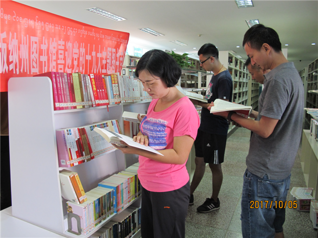 为了迎接党的十九大胜利召开,州图书馆从2017年9月1日开始在电子移动图书馆、图书自助借阅室、电子阅览室开设“喜迎党的十九大优秀图书”专柜推荐活动,吸引市民前来阅读。
